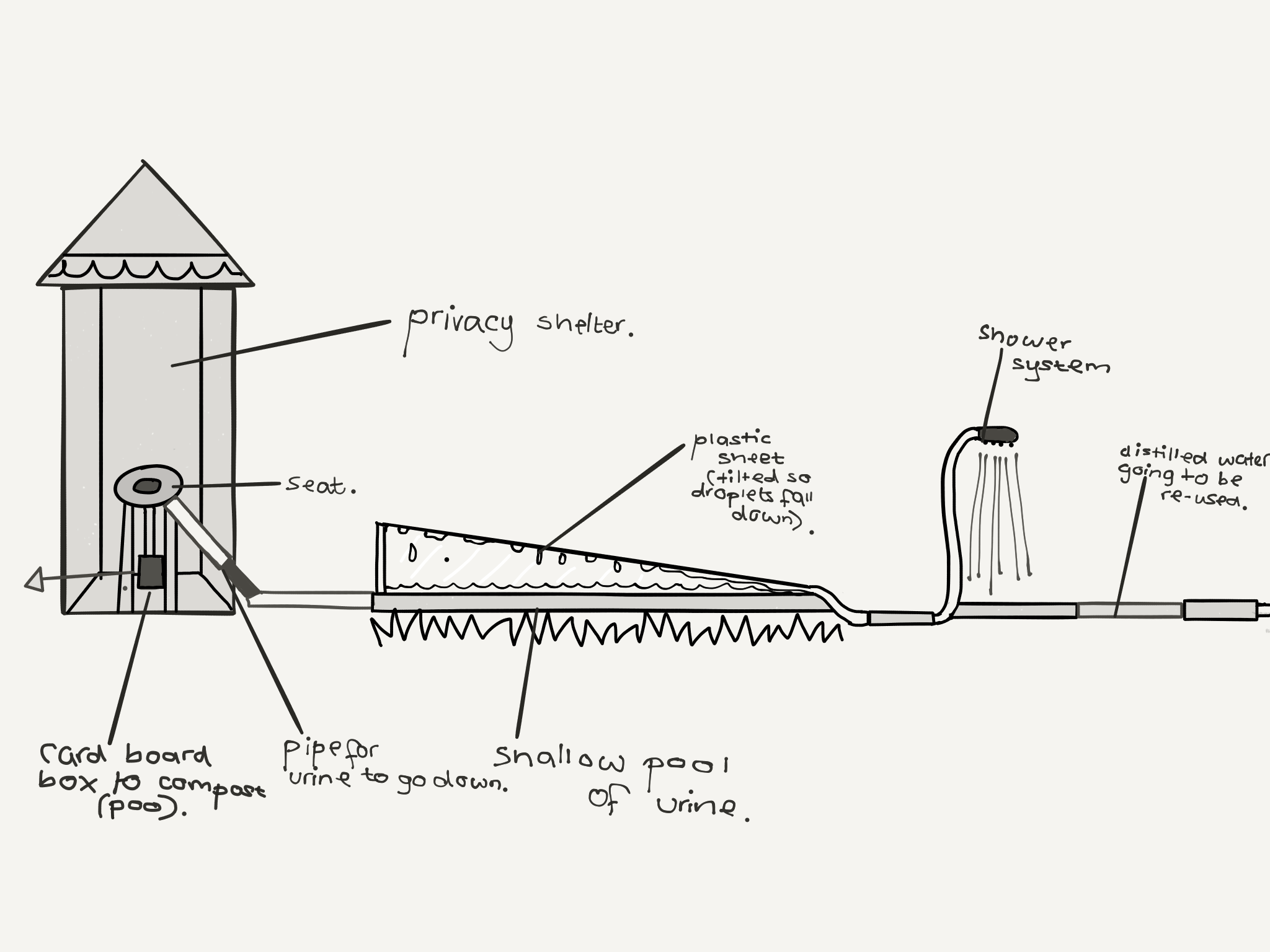 Our product is a sustainable toilet, mostly designed for countries hit by poverty (developing countries/Lower income countries). The idea is to give a clean and renewable toilets to satisfy all requirements. It will also keep all the citizens as clean and healthy as possible. Our product is designed to be ergonomic and satisfy the user with the sufficient means to relieve themselves. It is a series of interconnected pipes and processes however the mechanism once explained is relatively simple. The way our product works is that the user urinates through an elevated toilet seat then a sieve mechanism seperates the poo from the urine so that the urine descends down a tube and into a distillation pool. This pool is shallow and above ground, thus allowing the sun's warmth to sufficiently heat up the raised plastic sheet placed here to collect the rising condensation from the urine below. When the droplets of pure water have gathered on the sheet they will trickle down and fill a tube. This tube will be linked to a showering system, this will allow the inhabitants of the country to keep their bodies clean. The reason we designed it so that the toilet and the showering system are conjoined is because is because the health of the person concerned stays considerably better due to easy access to highly sterile relieving systems. |
